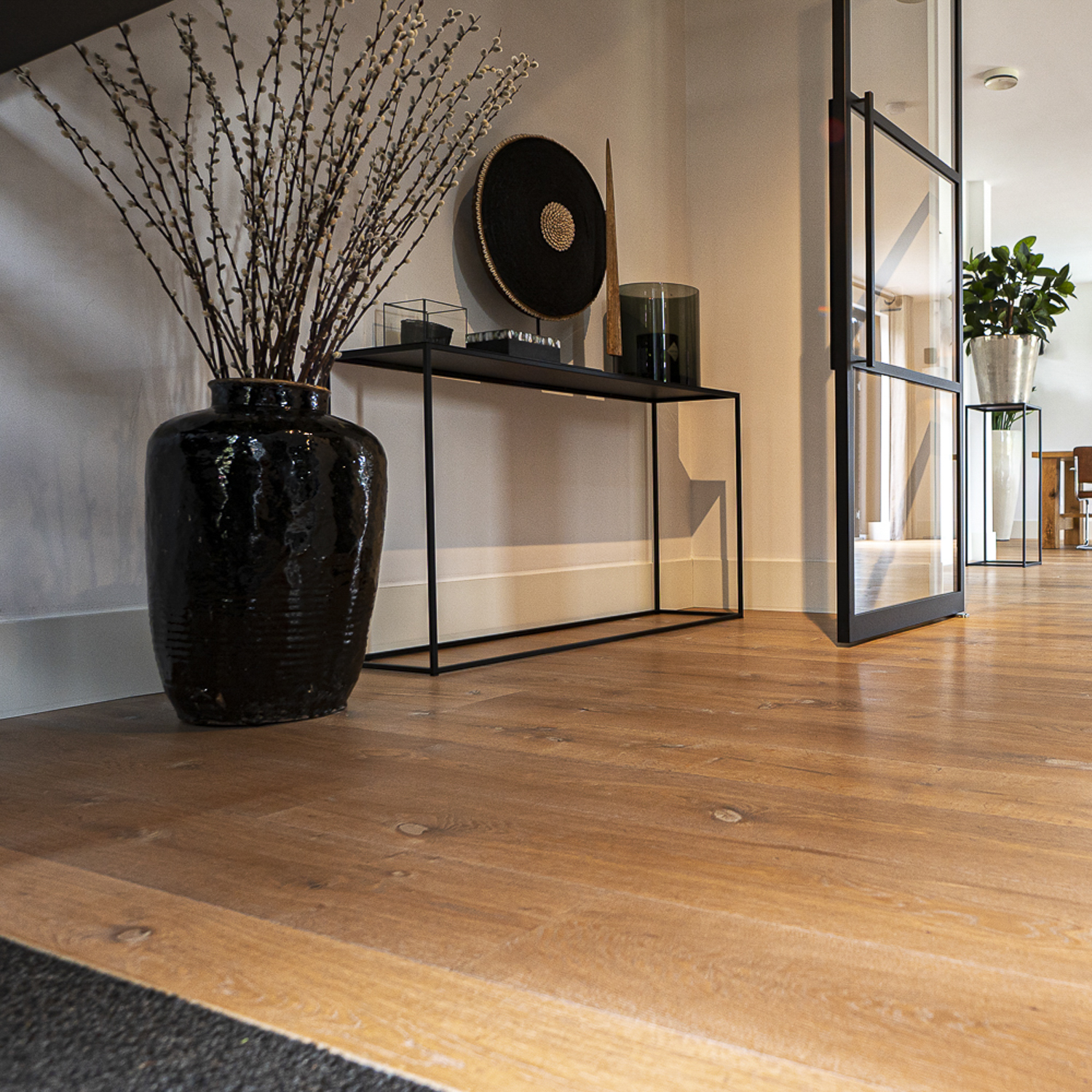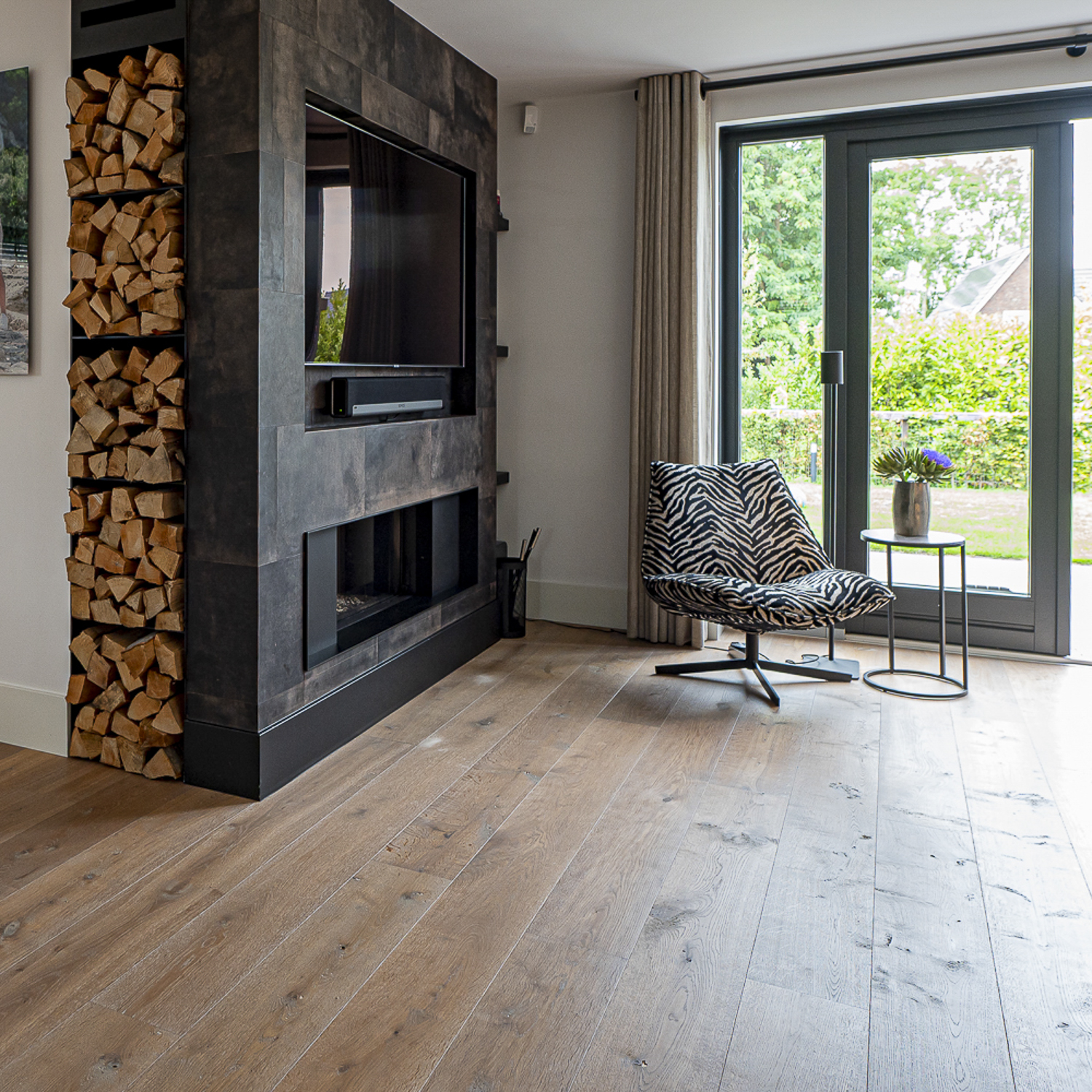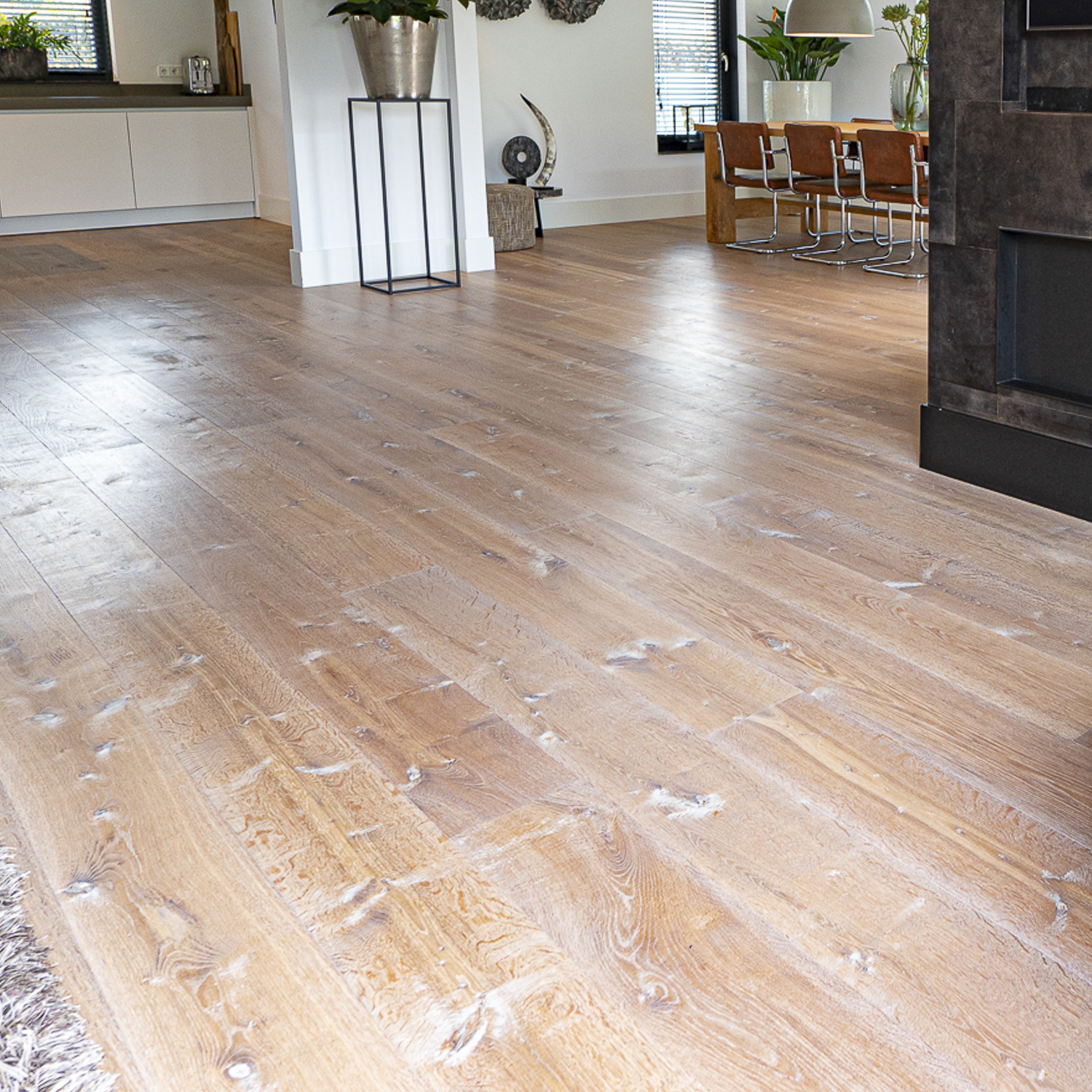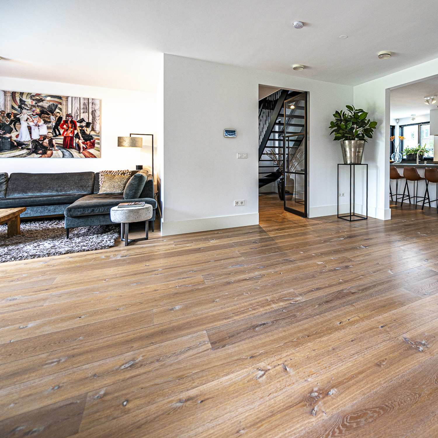 In deze woning hebben we een eiken duoplank van 22cm breed volverlijmd gelegd. De vloer is gerookt, geschaafd en vanaf fabriek wit geolied.